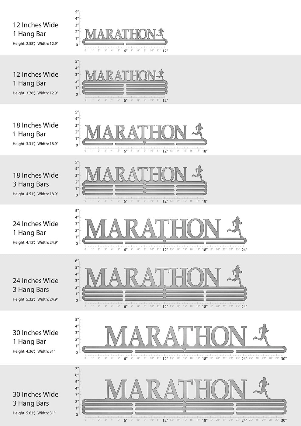 Unsure what size to get? We have created two consistently scaled images to show you what different sized displays look like when filled with medals.