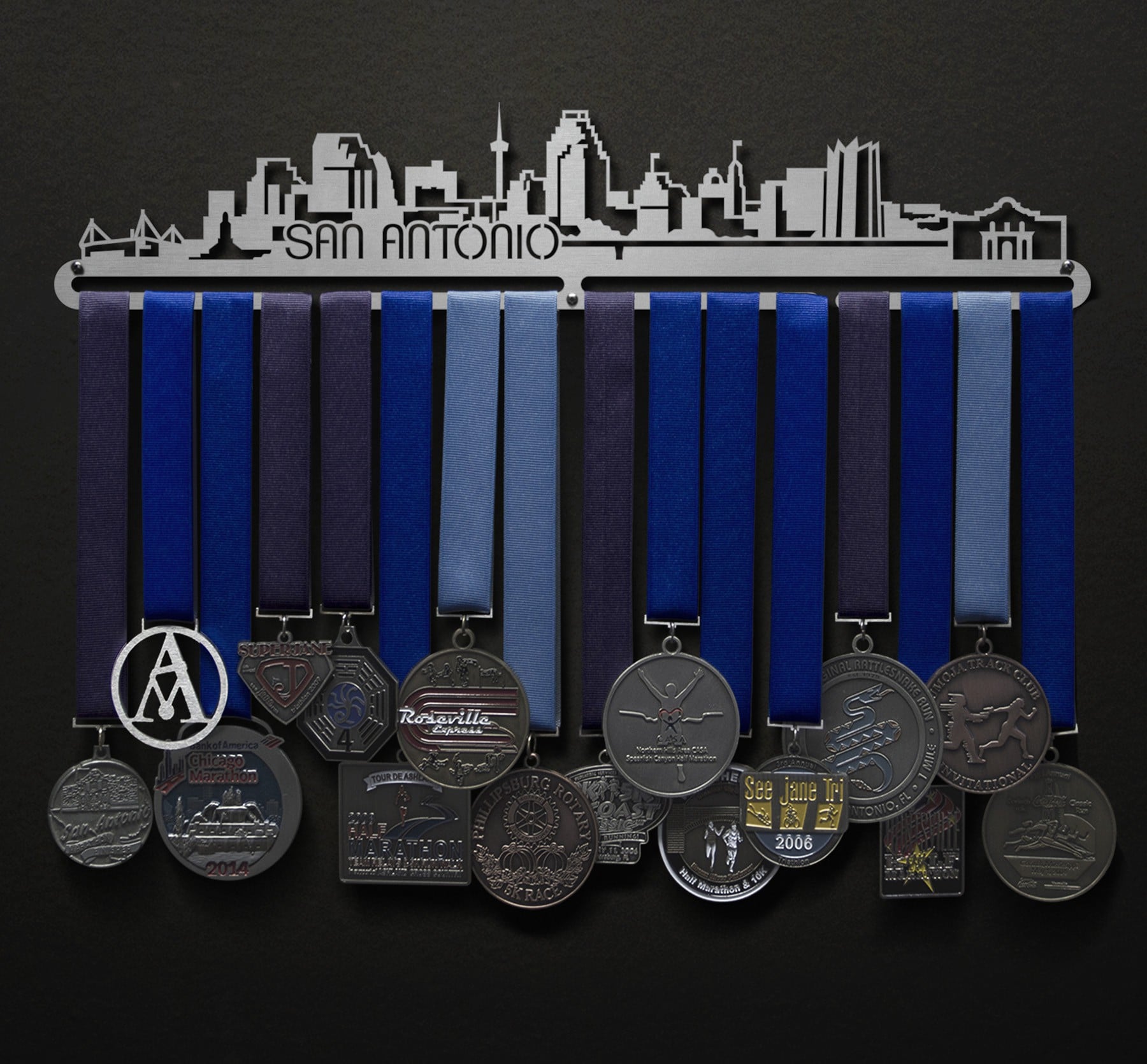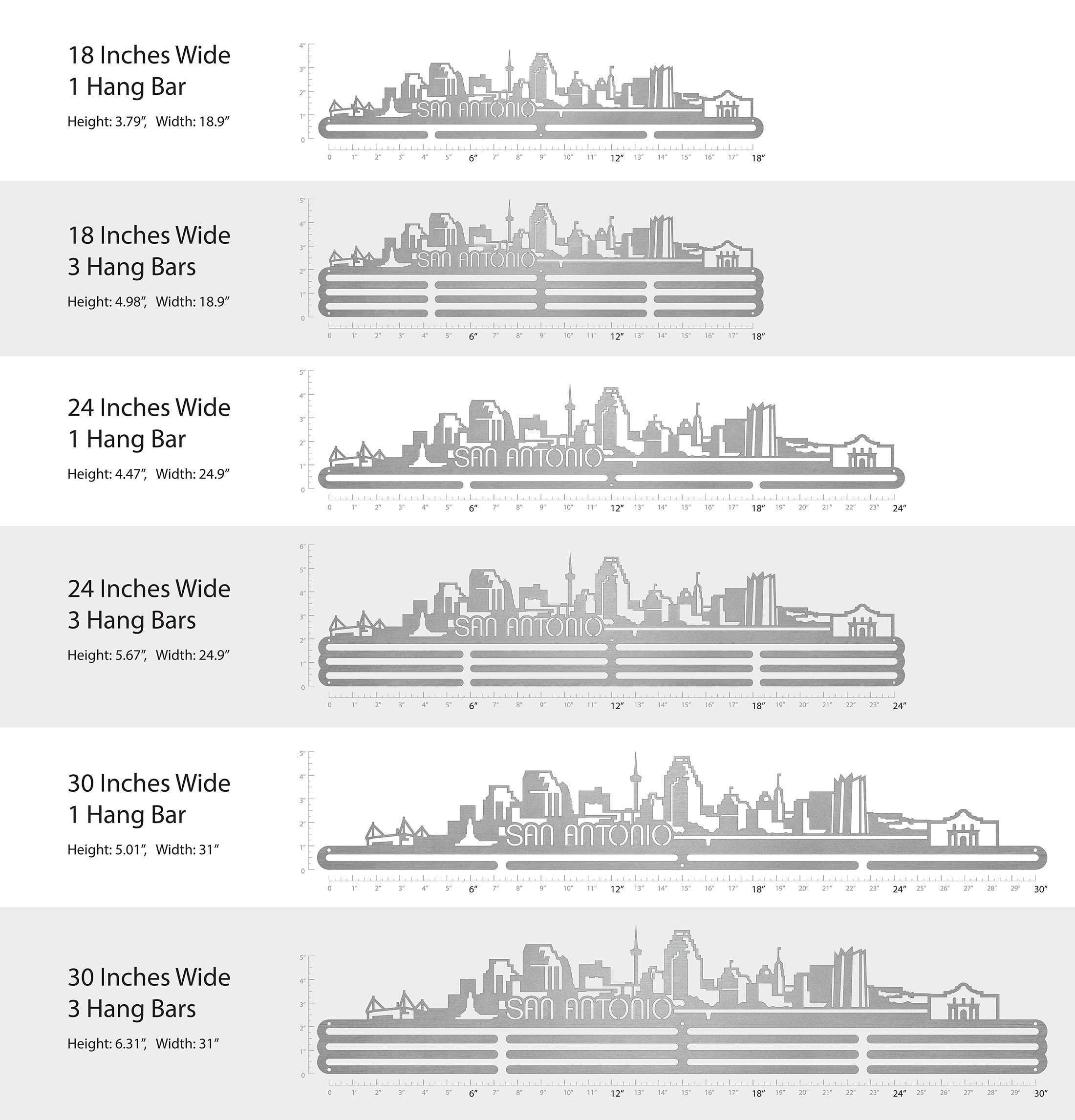 Unsure what size to get? We have created two consistently scaled images to show you what different sized displays look like when filled with medals.