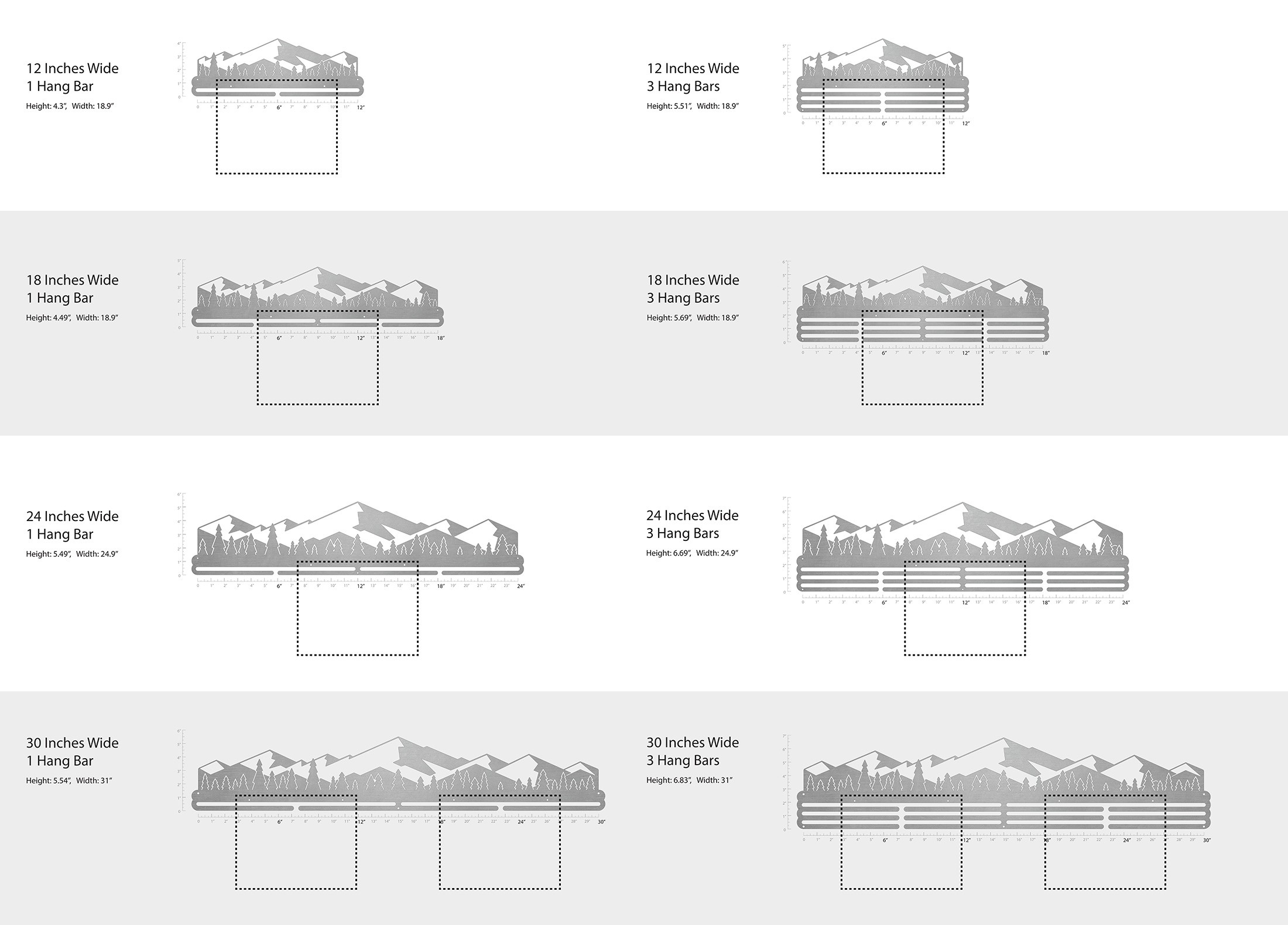 Unsure what size to get? We have created two consistently scaled images to show you what different sized displays look like when filled with medals.