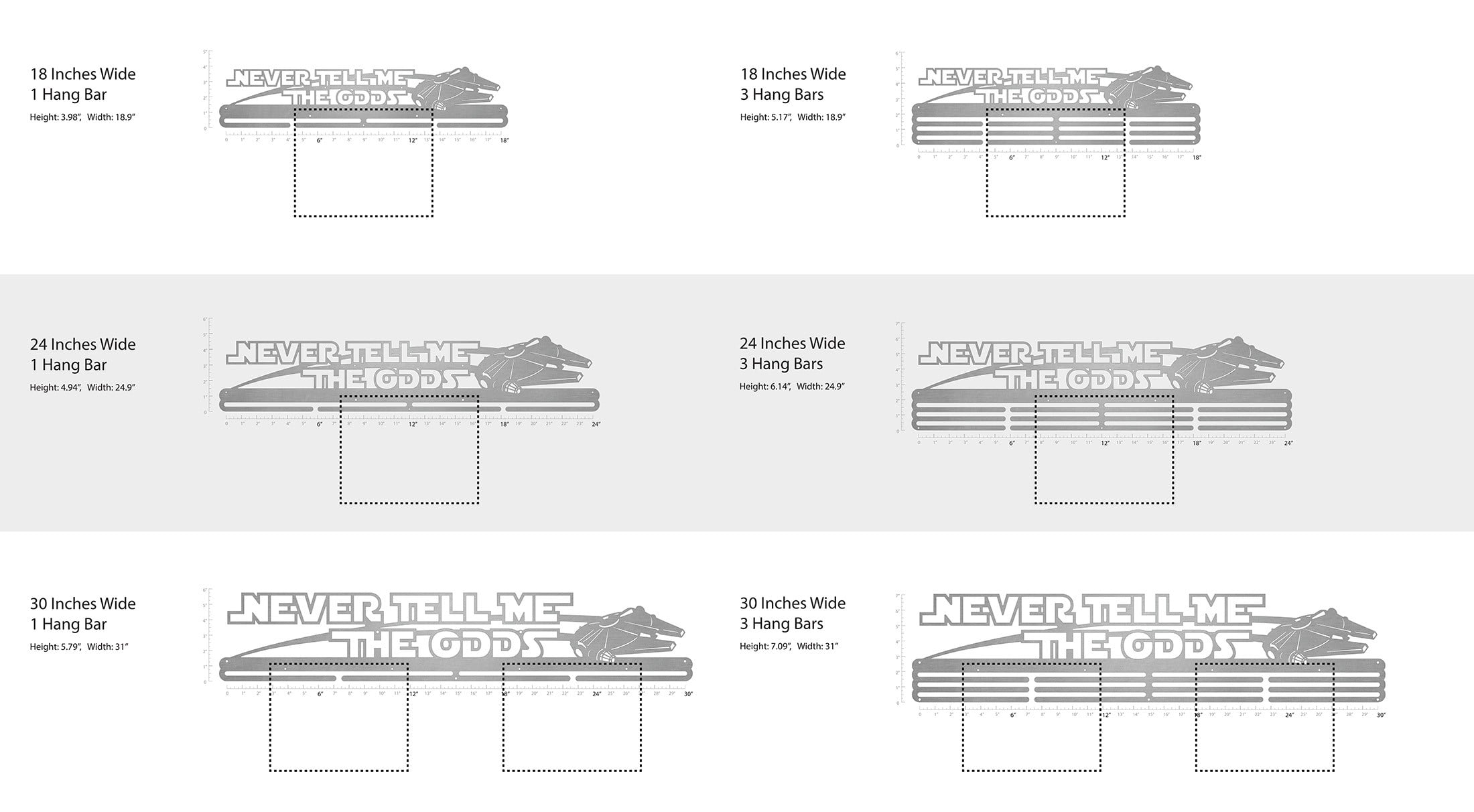 Unsure what size to get? We have created two consistently scaled images to show you what different sized displays look like when filled with medals.