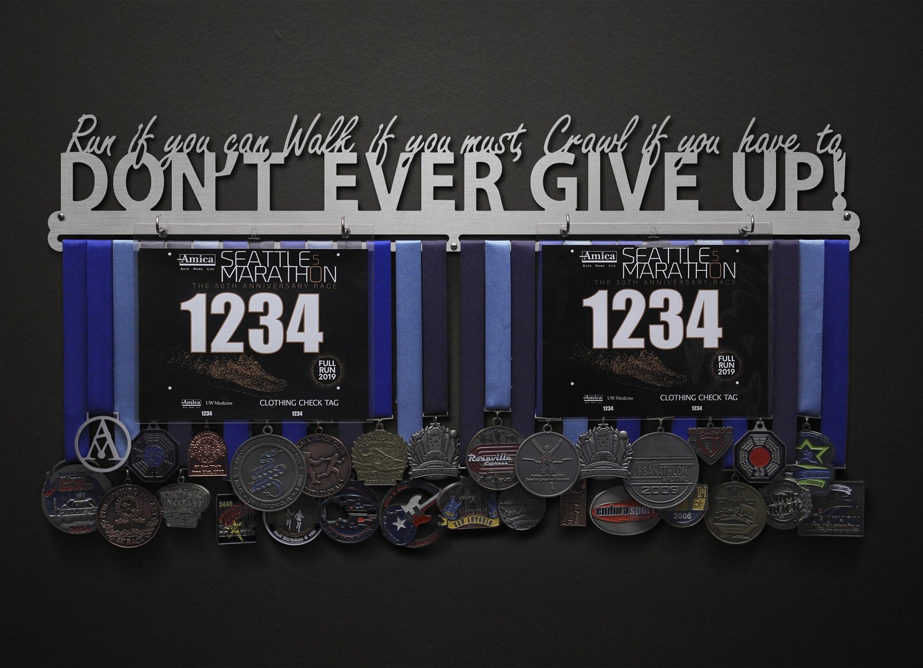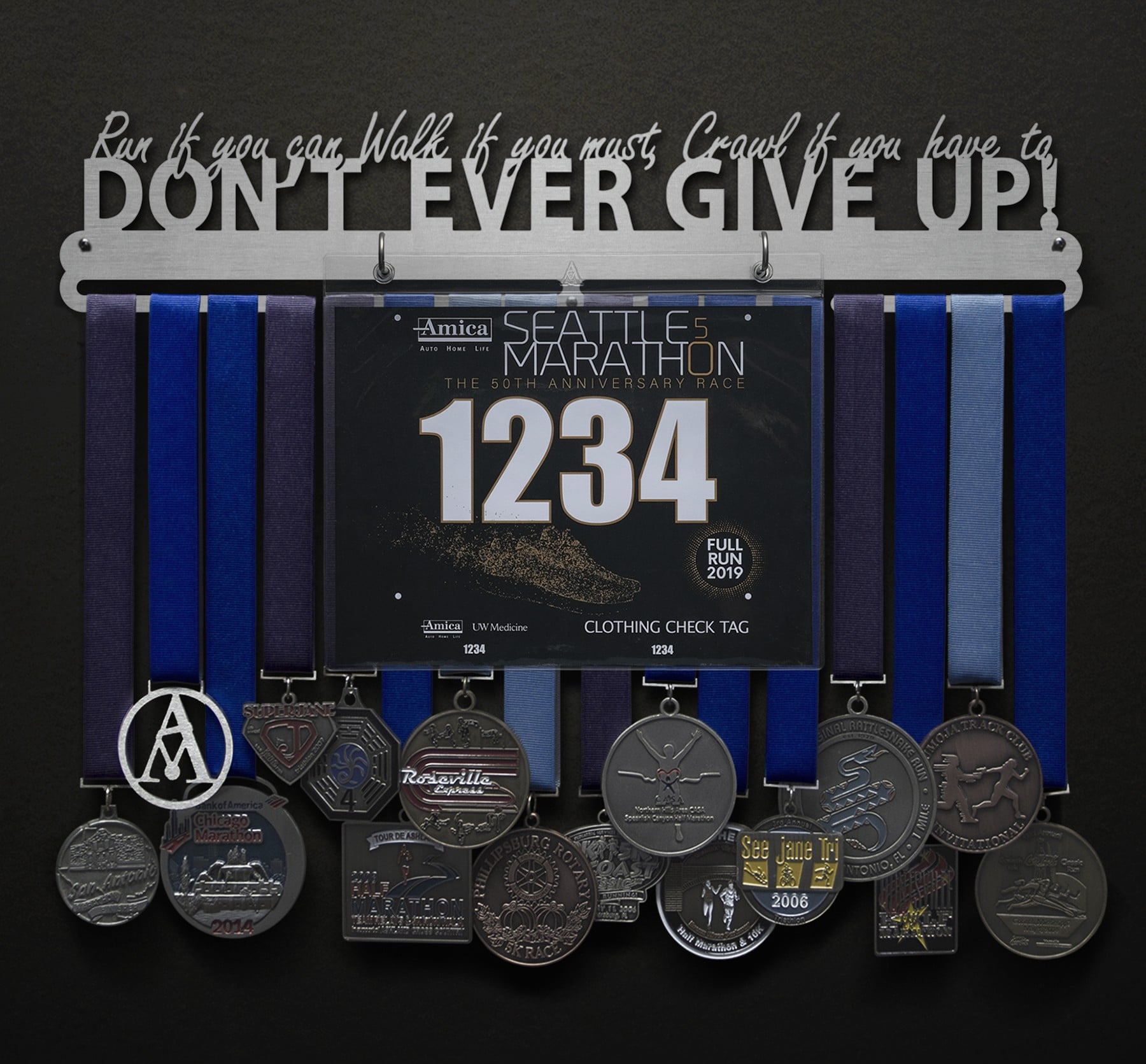 Run, Walk, Crawl - Don't Ever Give Up! Bib and Medal Display