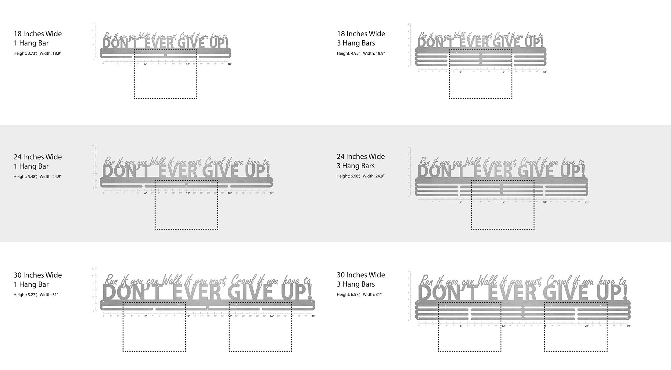 Unsure what size to get? We have created two consistently scaled images to show you what different sized displays look like when filled with medals.