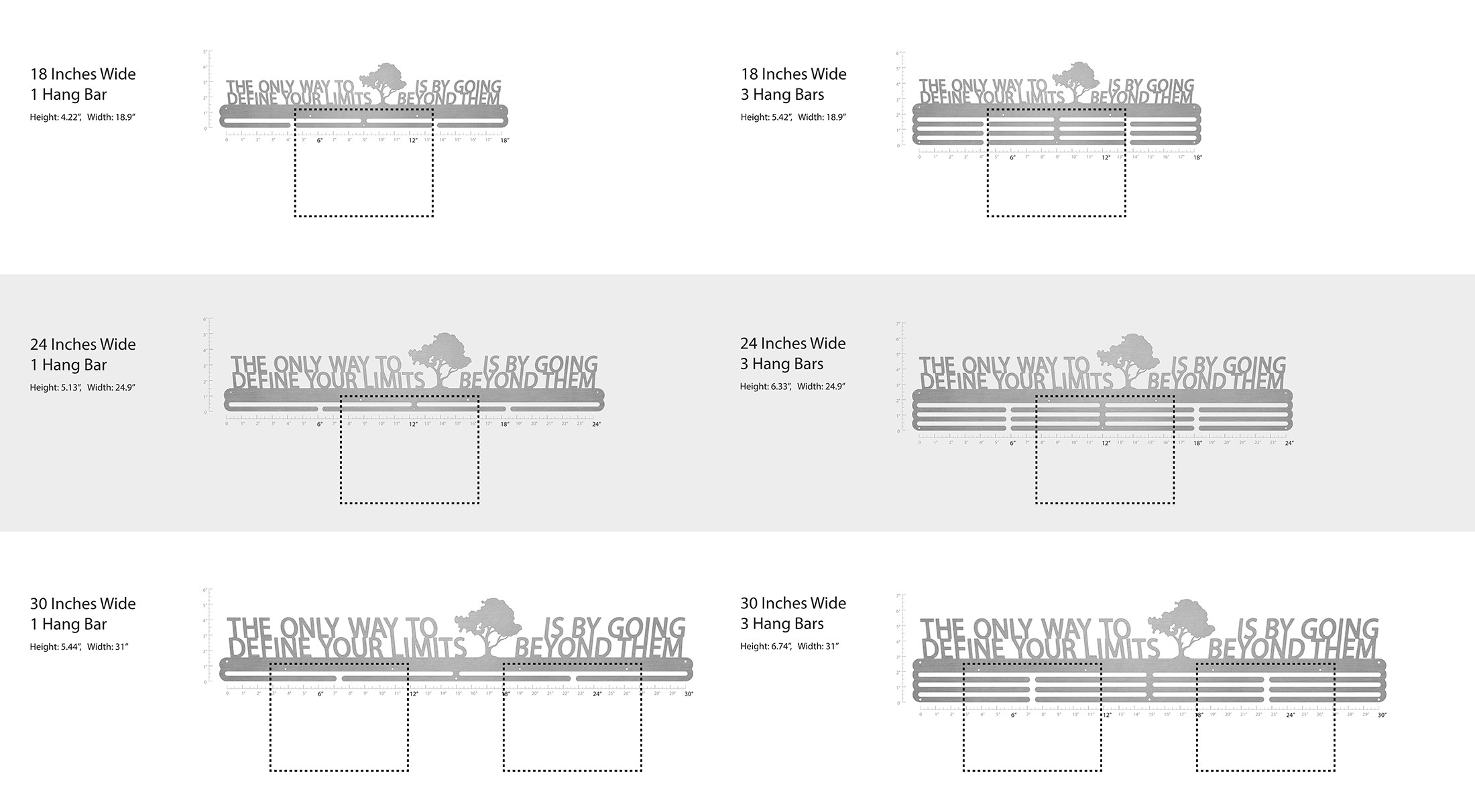 Unsure what size to get? We have created two consistently scaled images to show you what different sized displays look like when filled with medals.