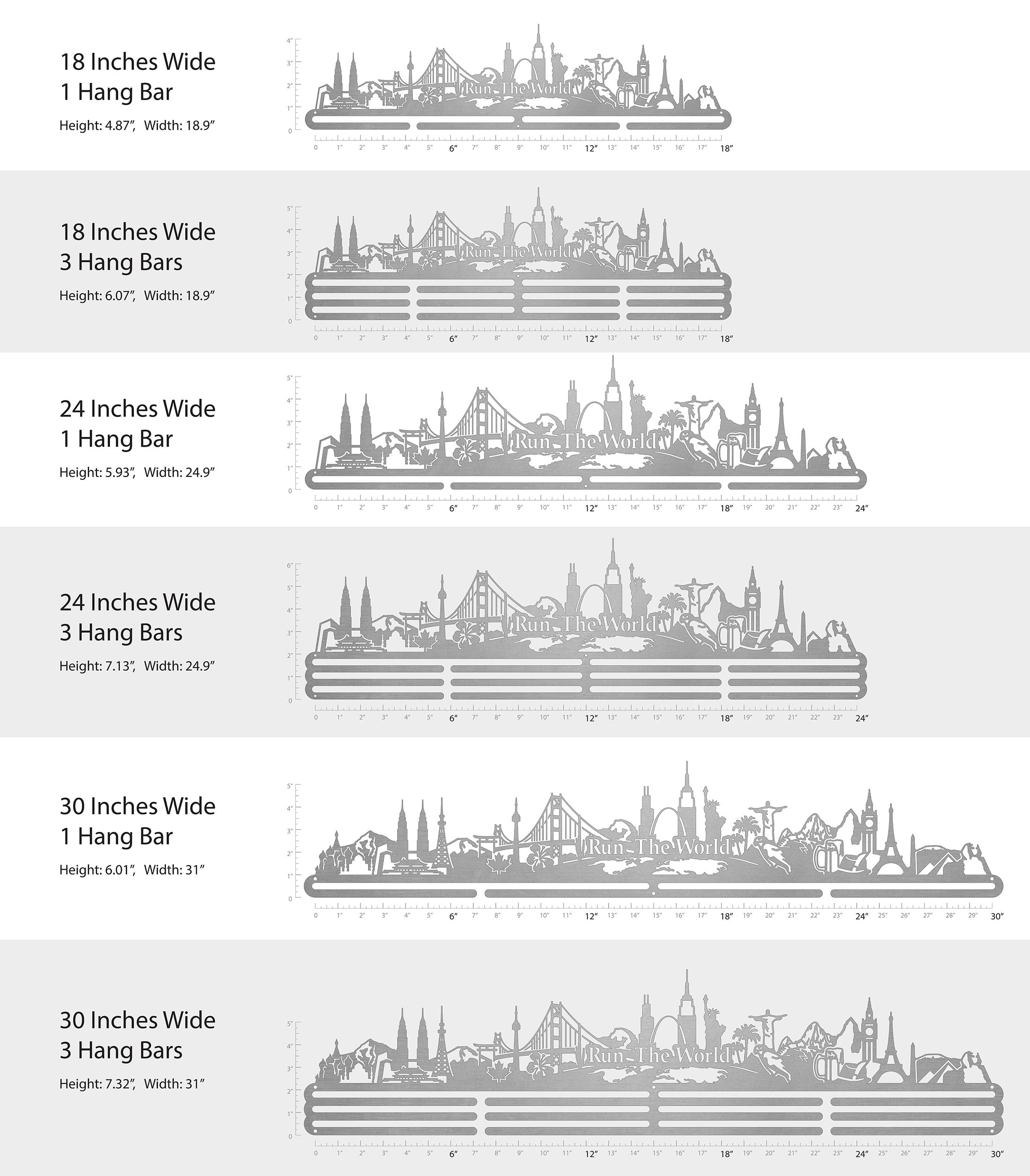 Unsure what size to get? We have created two consistently scaled images to show you what different sized displays look like when filled with medals.