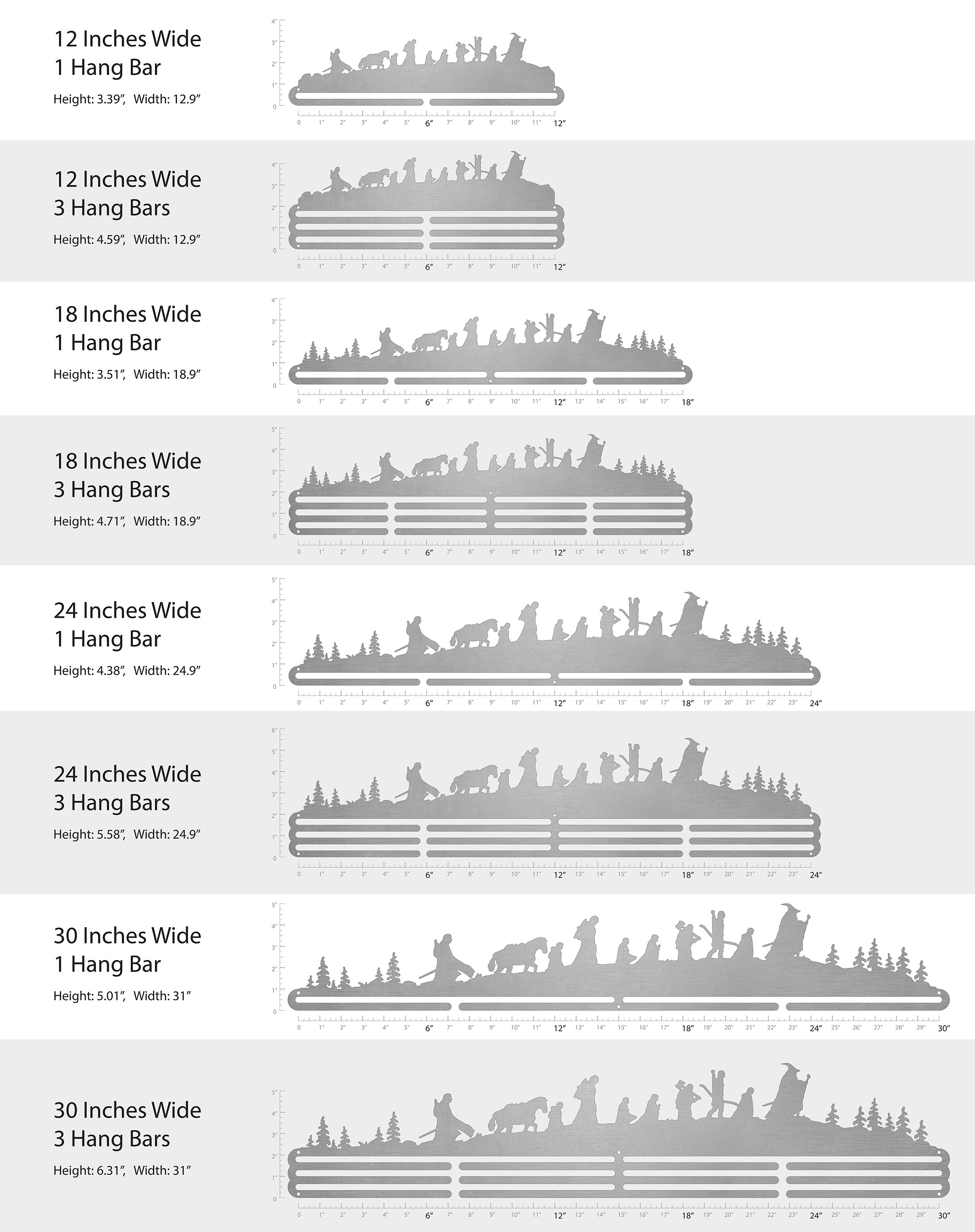 Unsure what size to get? We have created two consistently scaled images to show you what different sized displays look like when filled with medals.