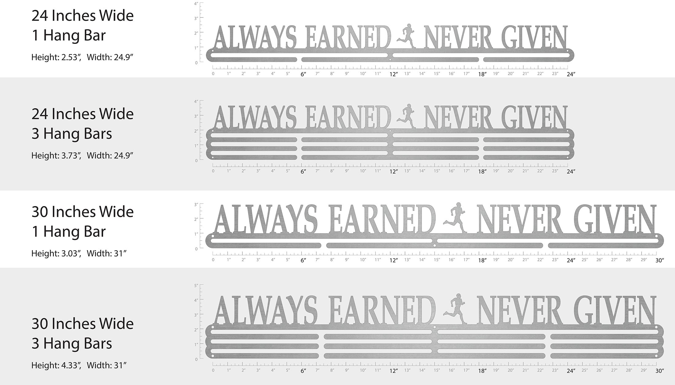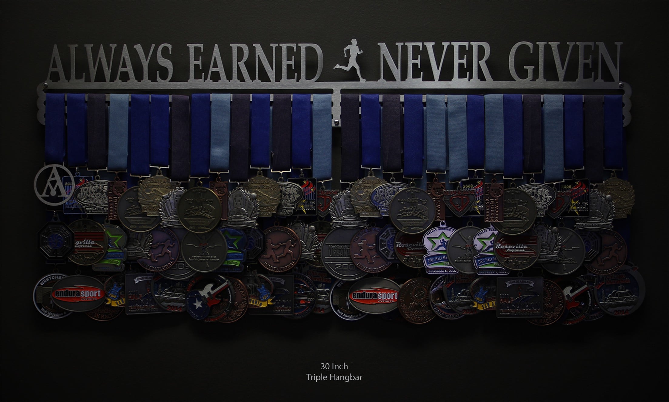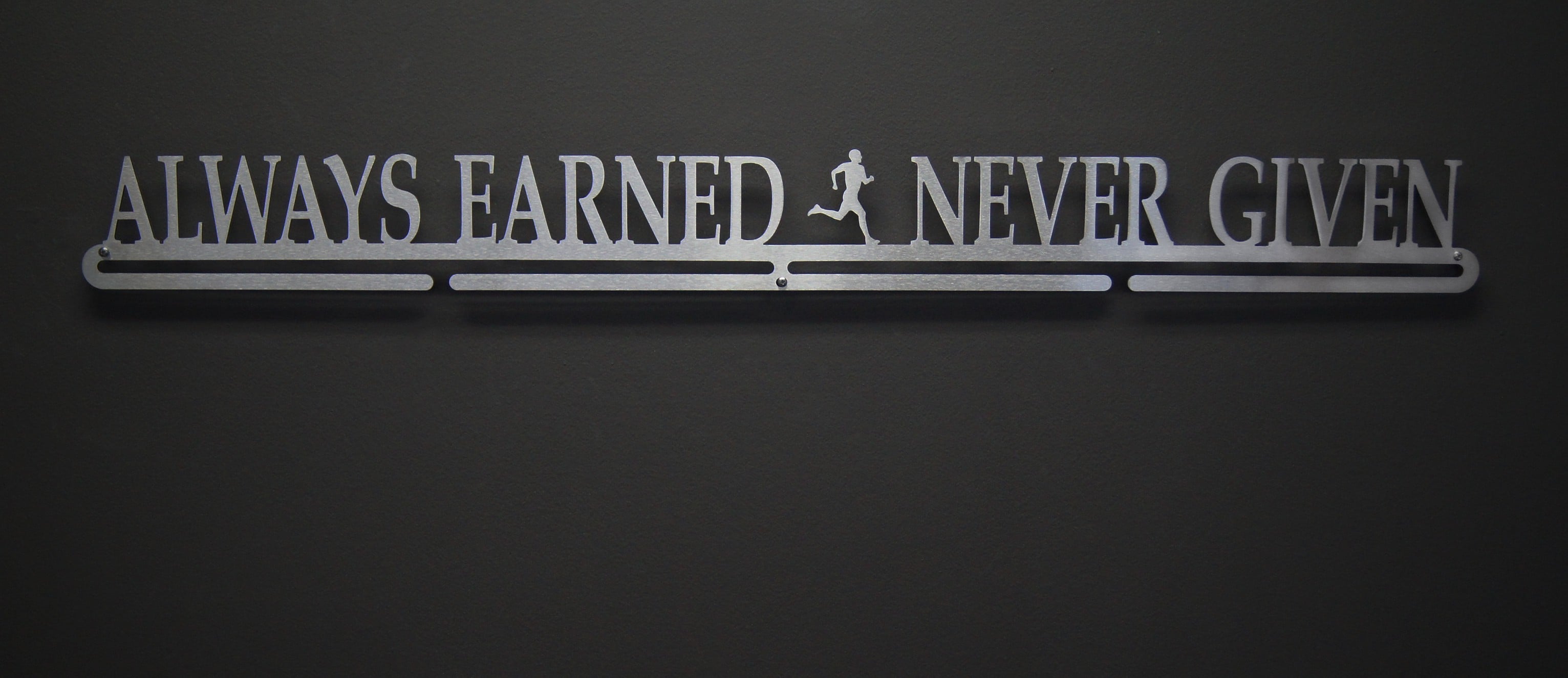 Anything you accomplish is accomplished by YOU. No one else can do it for you. Whether you're faced with a tough game, grueling race, or long distance marathon, you can never expect to be given anything. Think of your medals as badges of courage, strength and determination. Then display them loud and proud with this laser cut brushed stainless steel medal display. This hanger is only for medals you have earned - never for given ones.