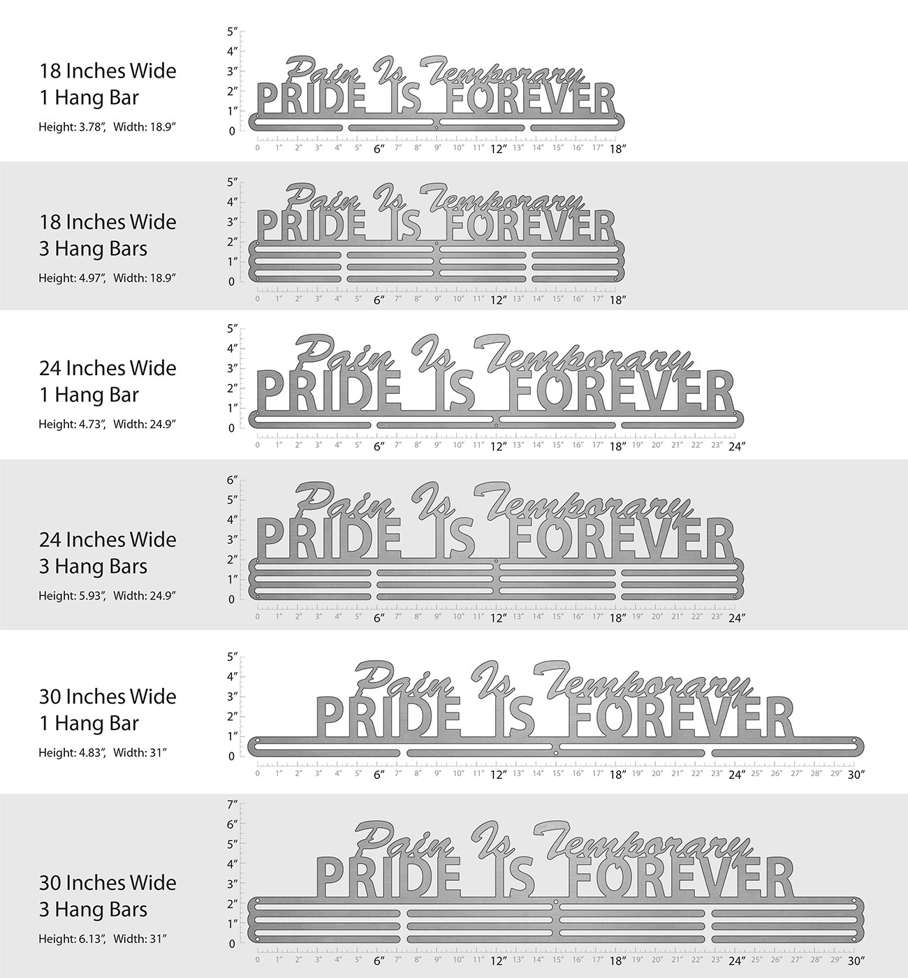 Unsure what size to get? We have created two consistently scaled images to show you what different sized displays look like when filled with medals.