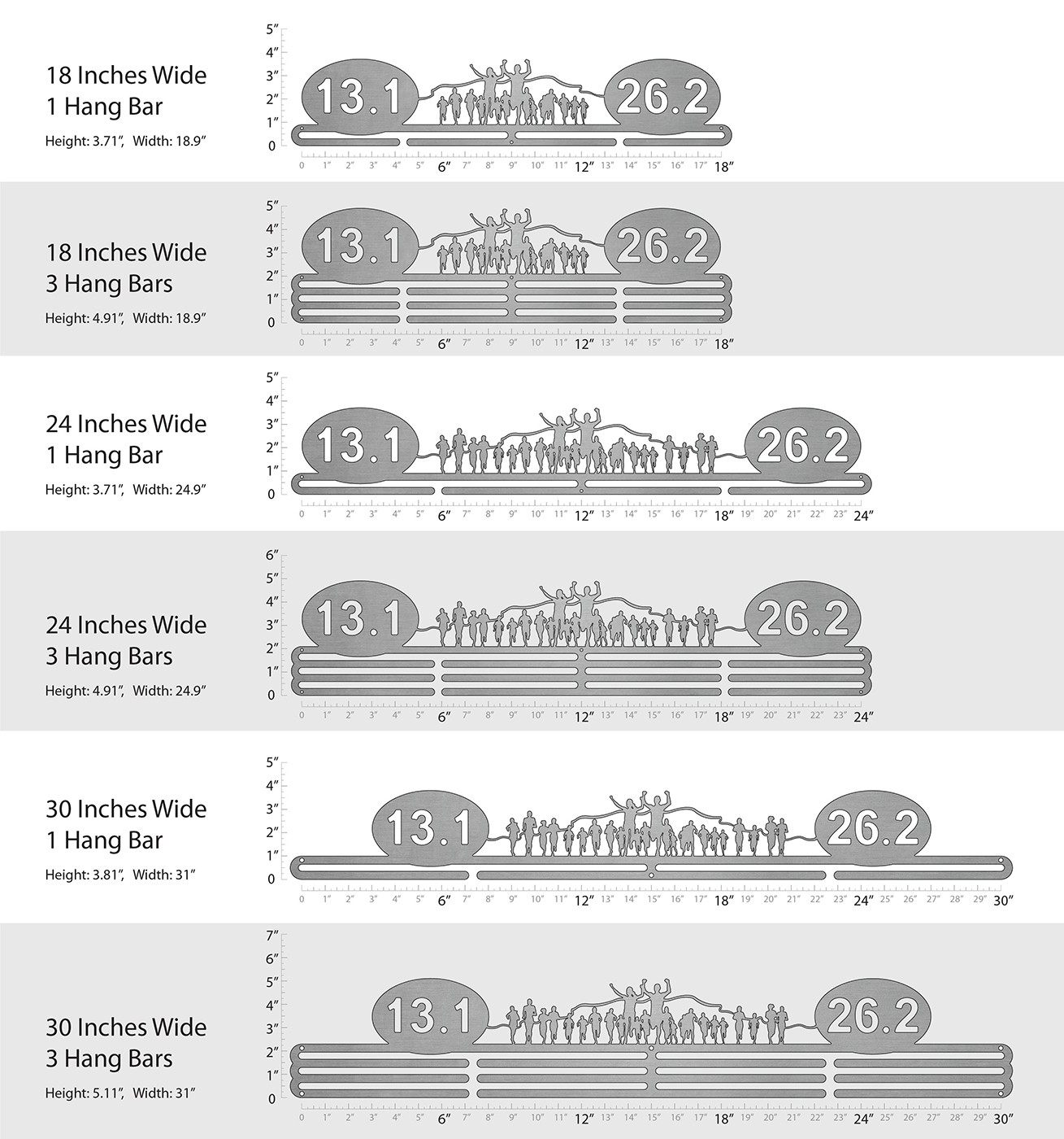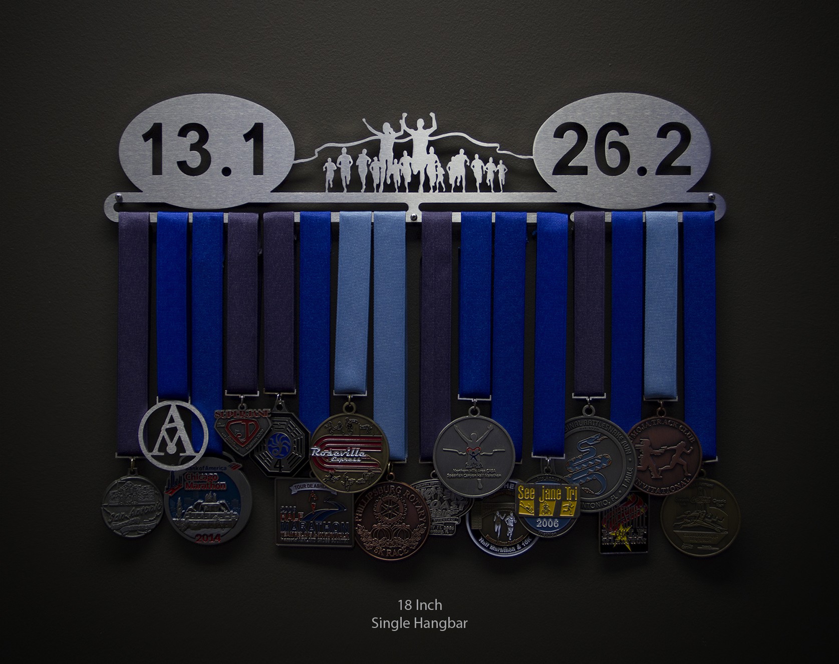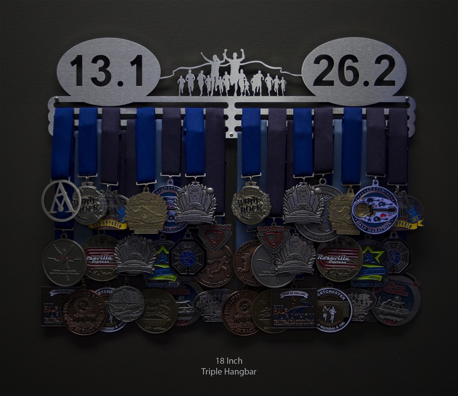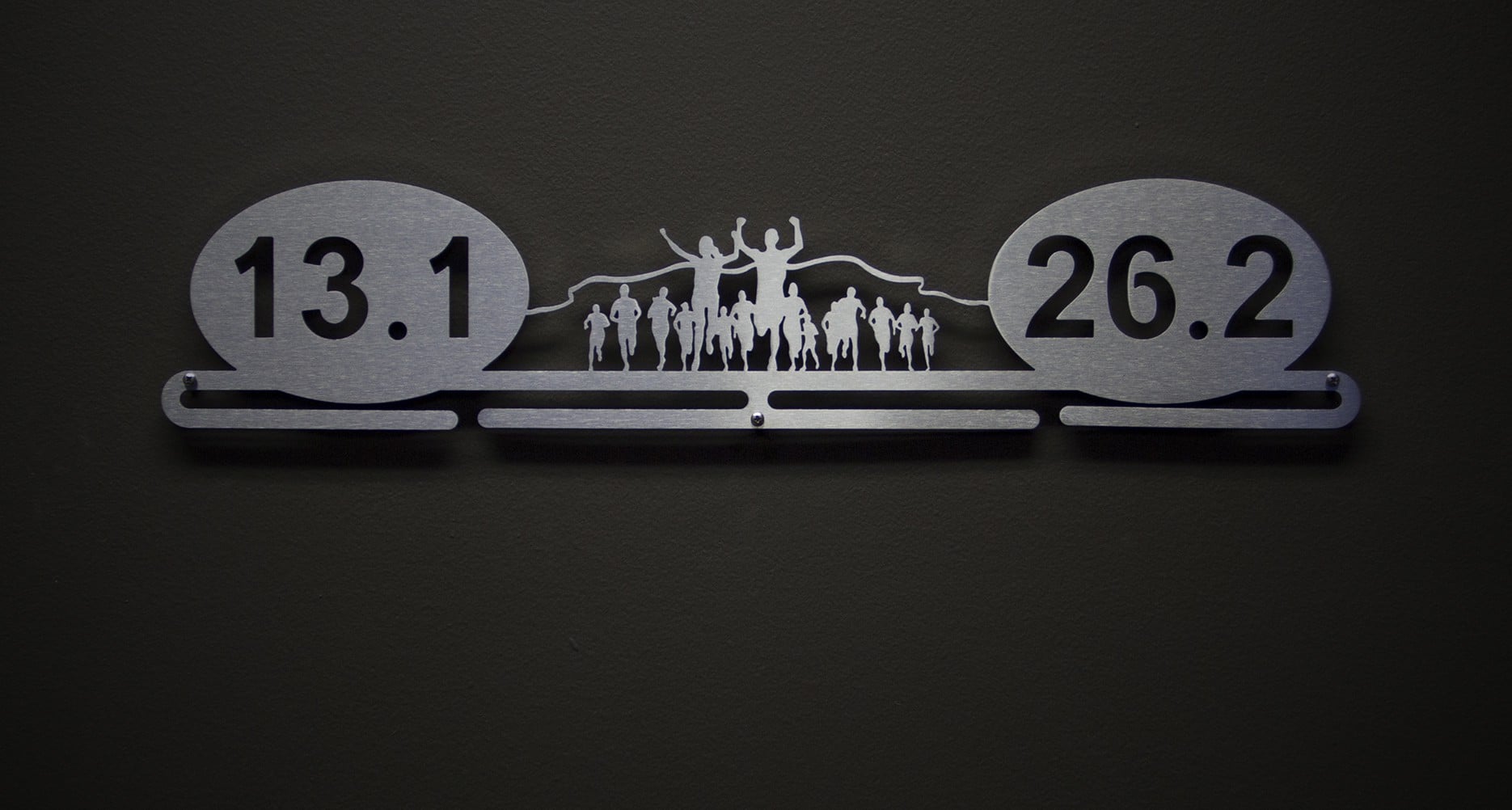 For runners with both half and full marathon finisher medals to display! The medal hanger is laser cut from brushed stainless steel for a look as elegant as you are determined.