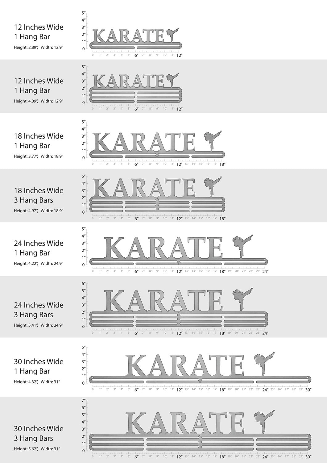 Unsure what size to get? We have created two consistently scaled images to show you what different sized displays look like when filled with medals.
