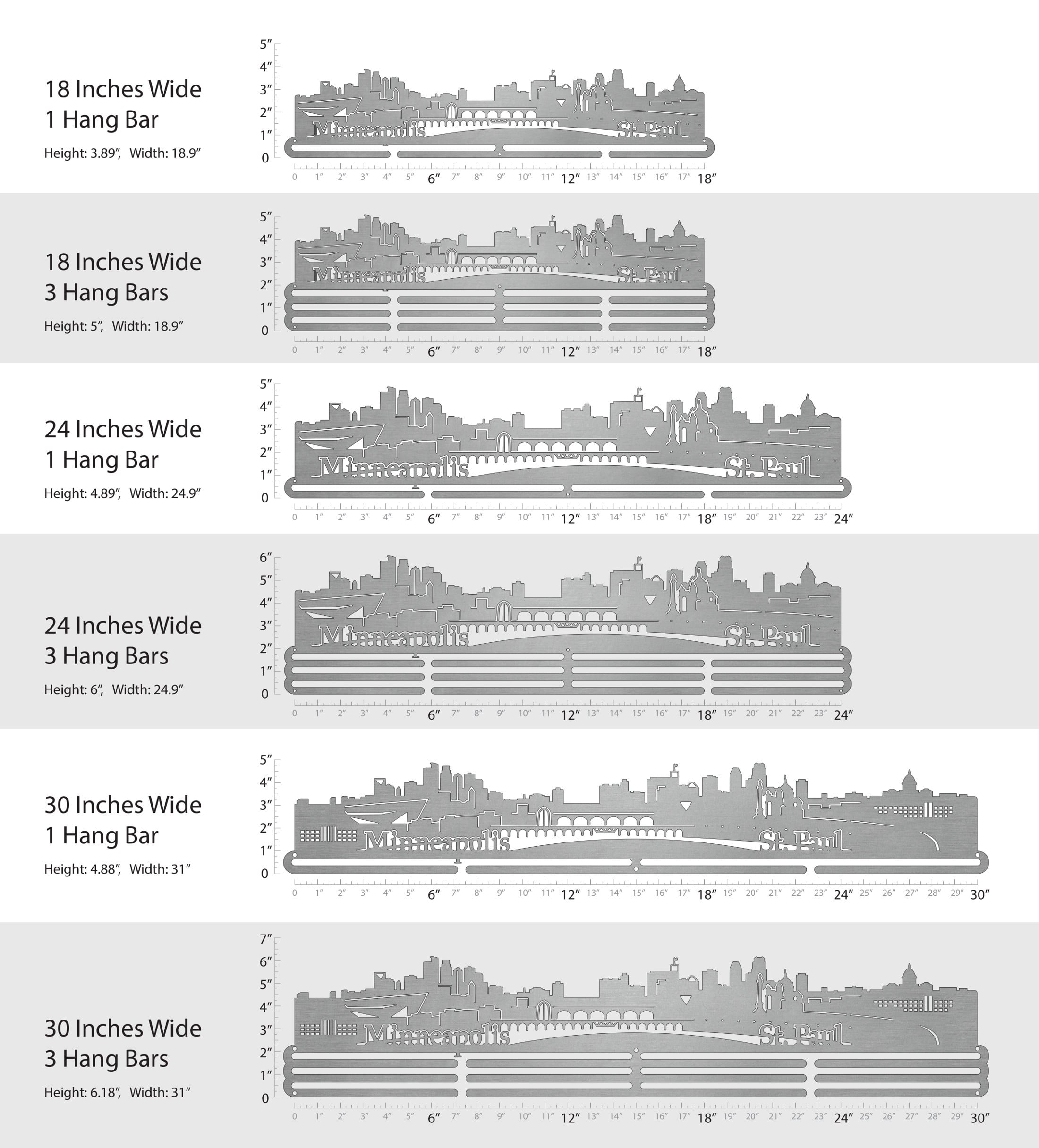 Unsure what size to get? We have created two consistently scaled images to show you what different sized displays look like when filled with medals.