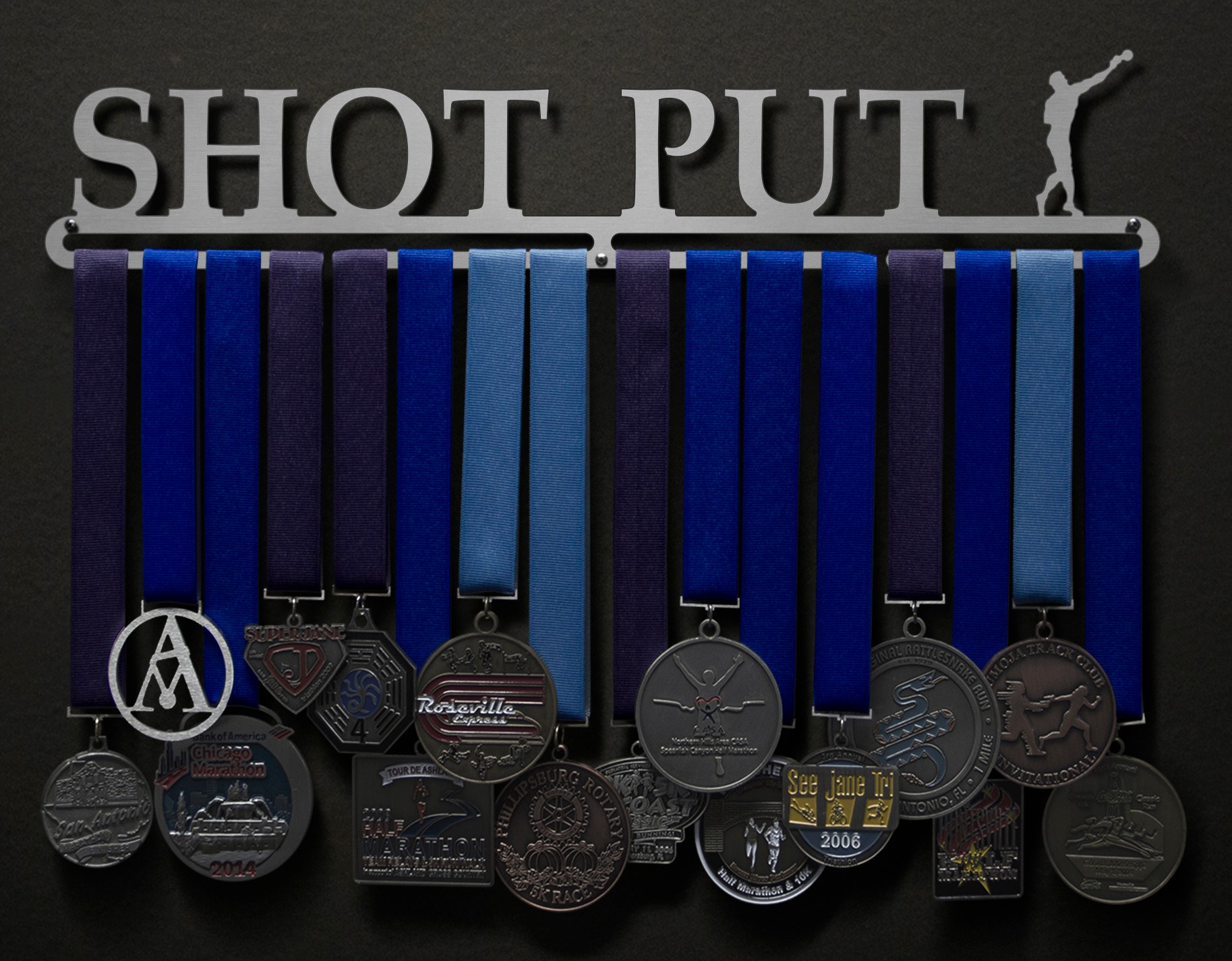 You worked so hard for the medal, just to toss it into a drawer?! Not anymore! Put some pride on your wall with this Shot Put medal hanger!