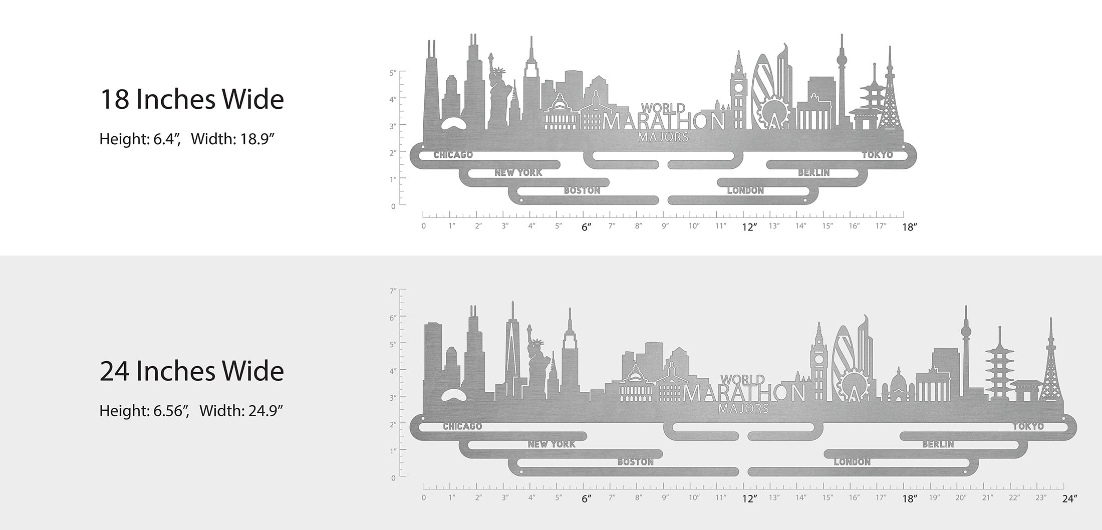 Unsure what size to get? We have created two consistently scaled images to show you what different sized displays look like when filled with medals.