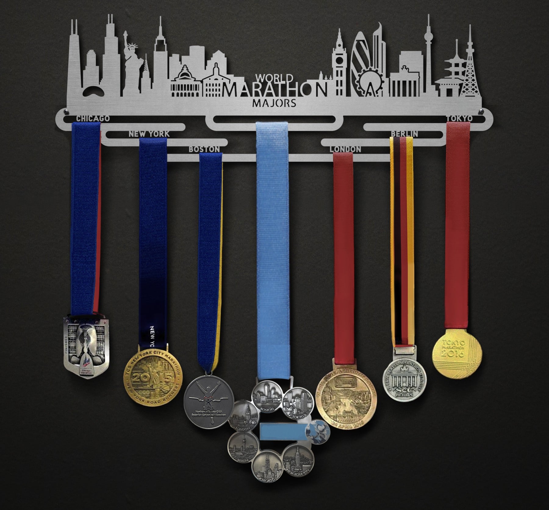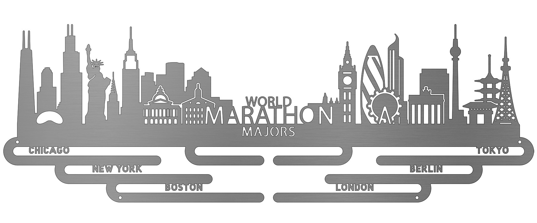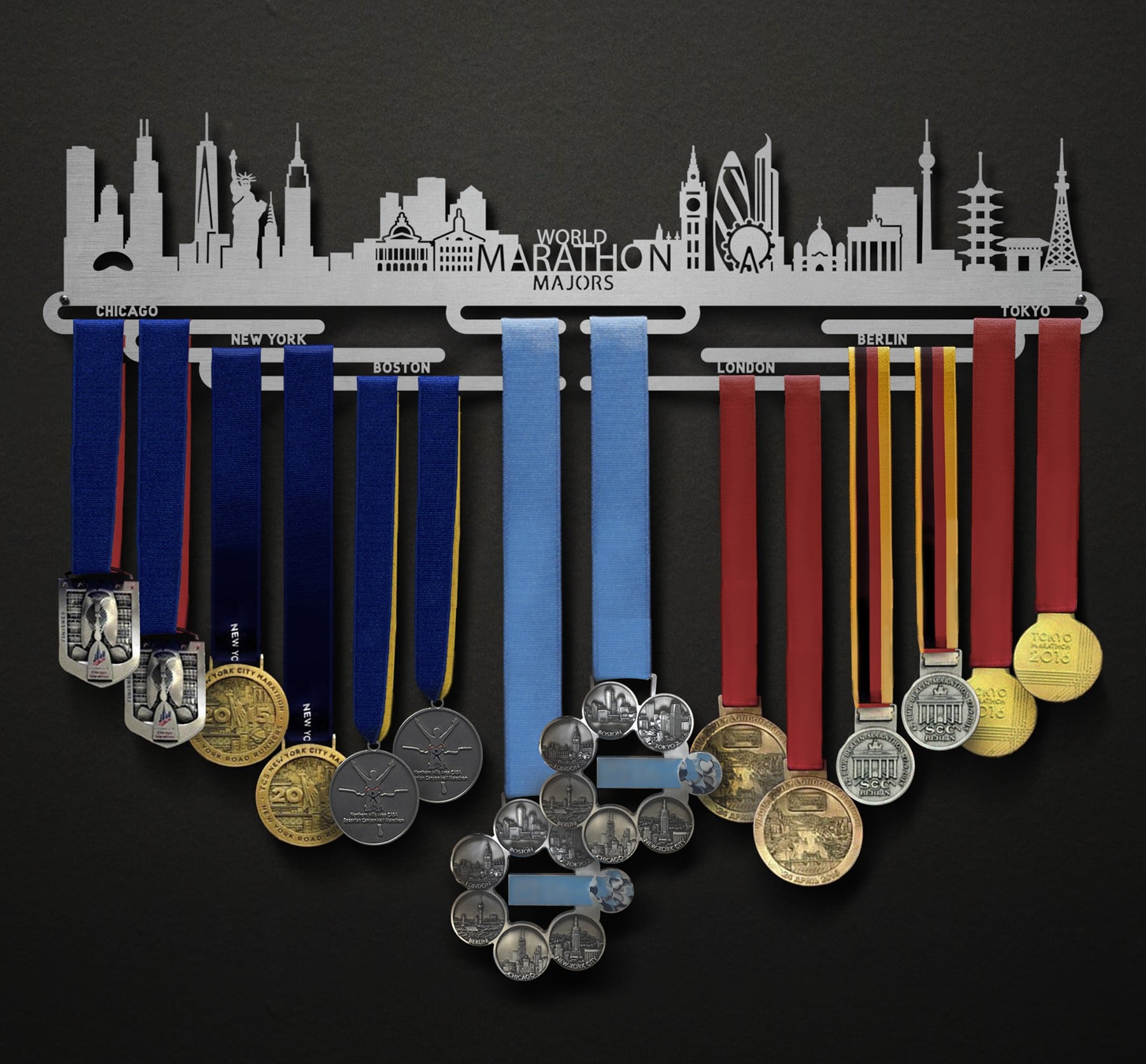 Our top-selling design of 2023, the World Marathon Majors - Cityscape Edition is a hit! We've included iconic buildings and imagery from each stop on the tour so you can commemorate your achievement with reminders of the journey along the way. We're so proud of this community for taking on such a monumental challenge! Now it's time to display your medals with pride.