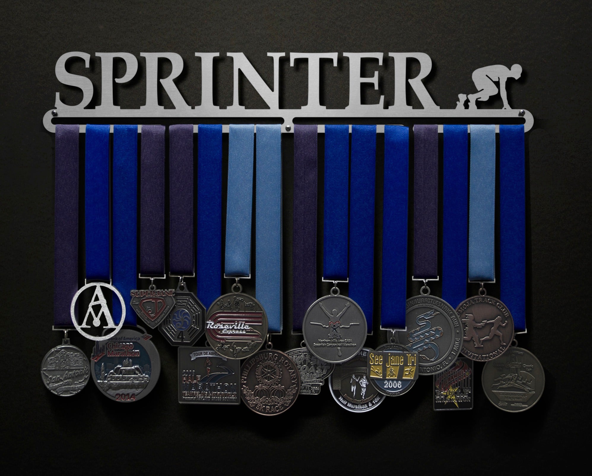 Put some pride on your wall with this Sprinter-inspired medal hanger! Every time you walk (or sprint!) by this medal hanger you will be reminded of all your hard work and dedication that got you this far, which will keep you focused and give you the extra motivation you need to keep moving forward!