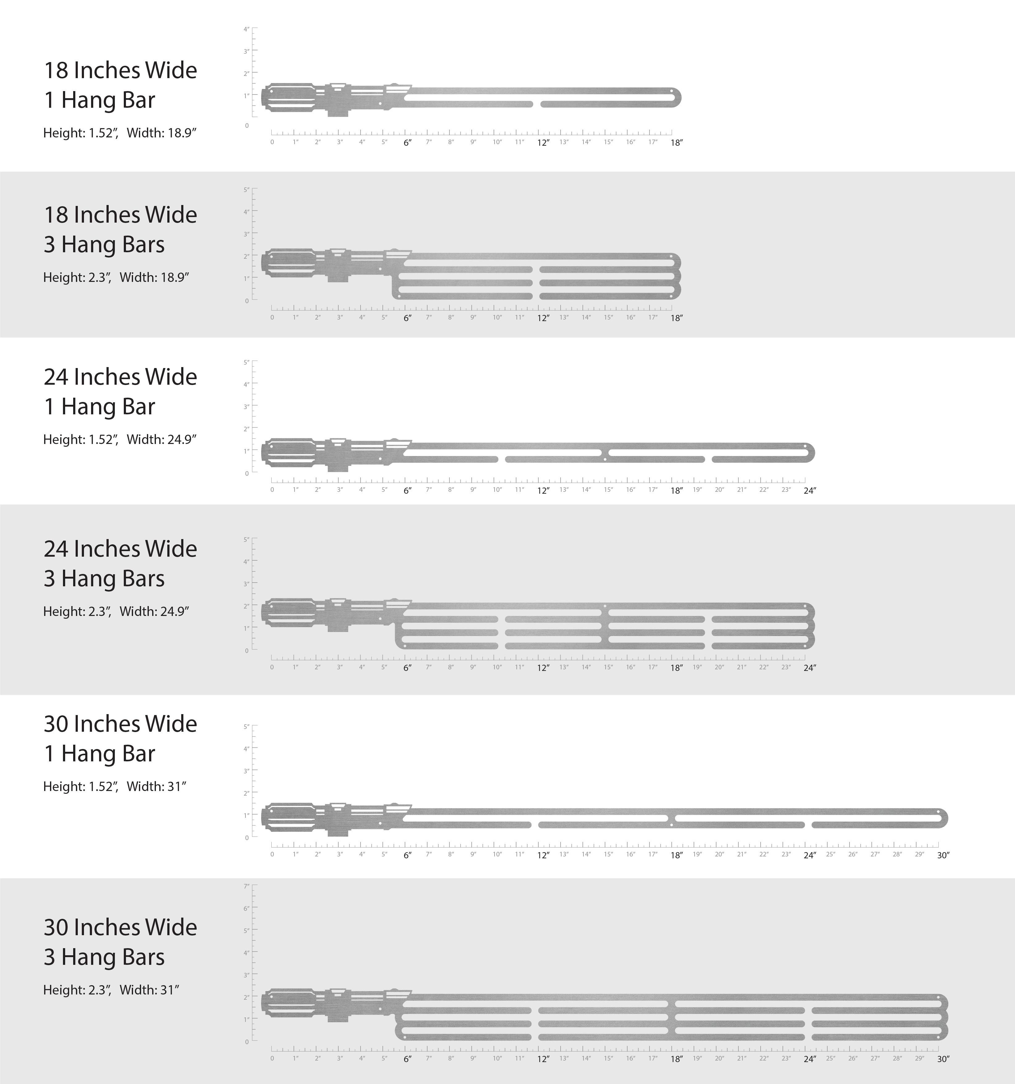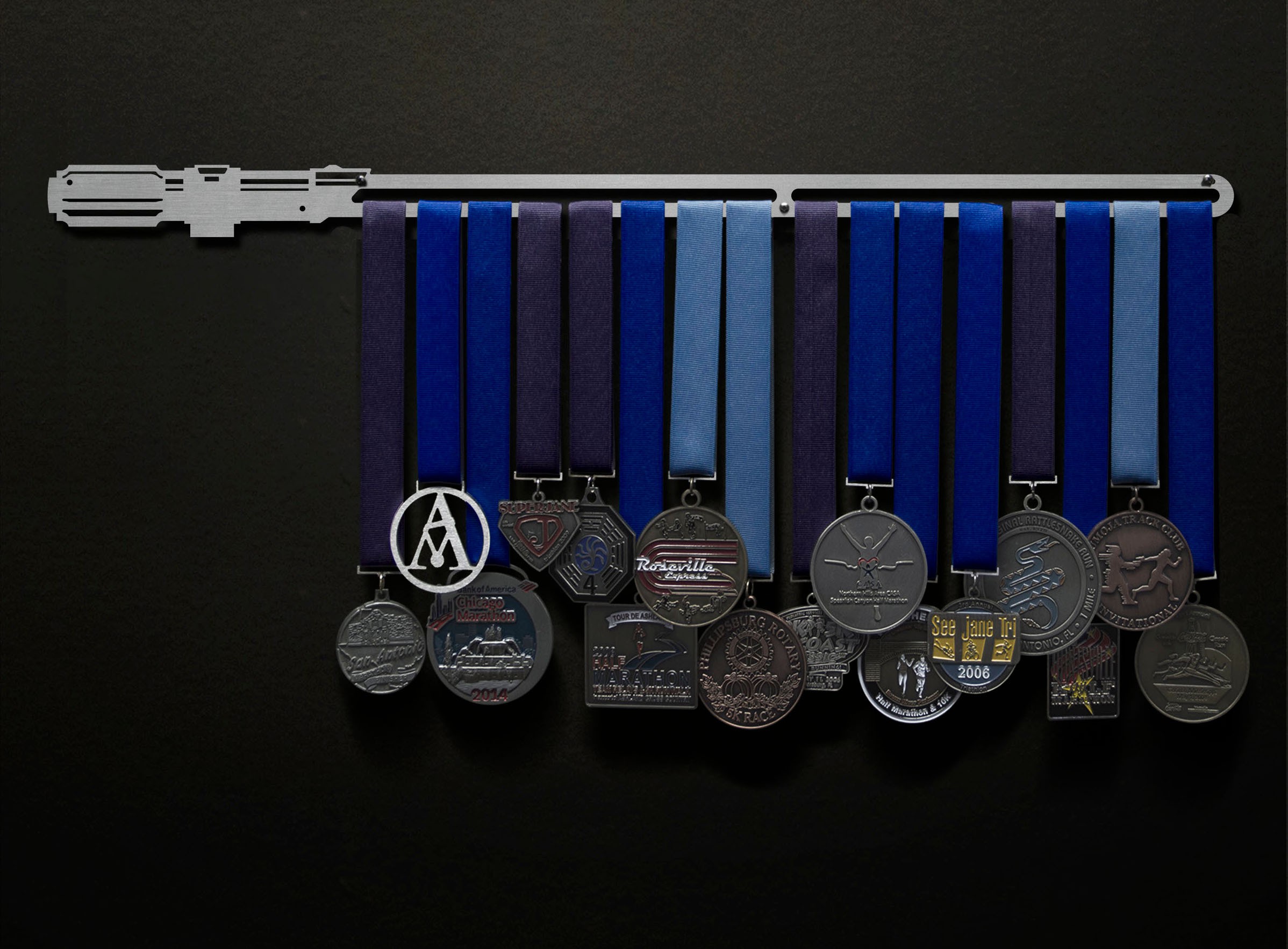 NOTE: The handle of the lightsaber design is about 6" wide, so an 18" wide design will hold roughly the same number of medals as a 12" wide design. Conversely, ordering a 24" size will have 18" of useable hang bar space and a 30" wide size will accommodate a similar amount of medals as a 24" wide medal hanger.