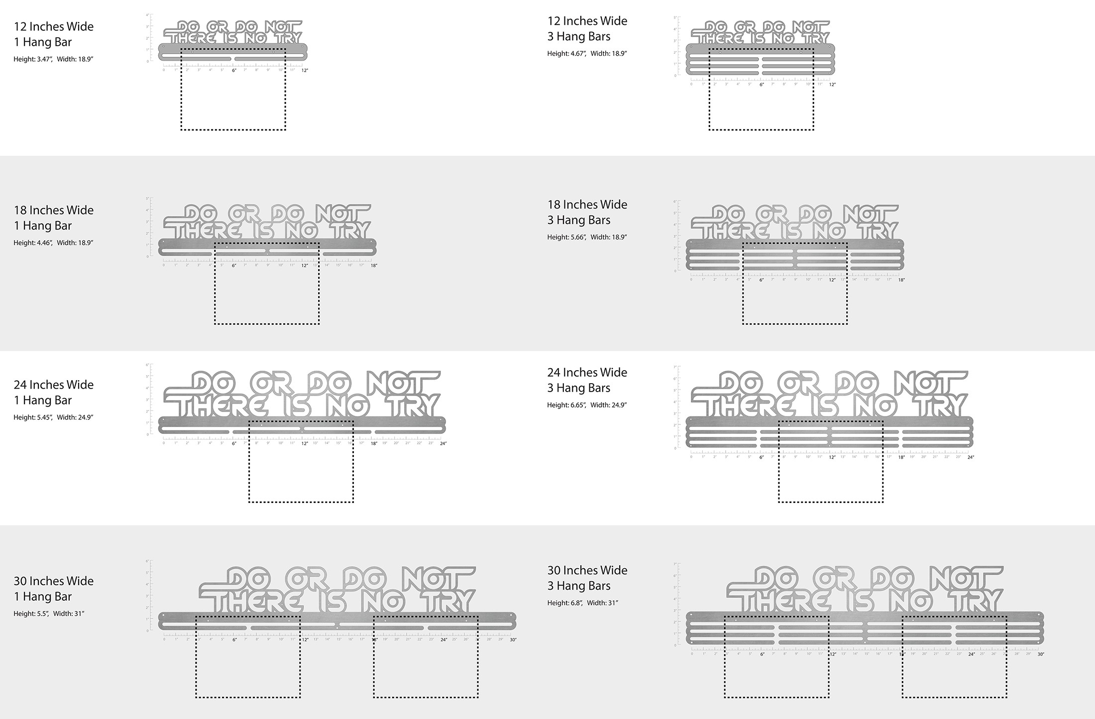 Unsure what size to get? We have created two consistently scaled images to show you what different sized displays look like when filled with medals.