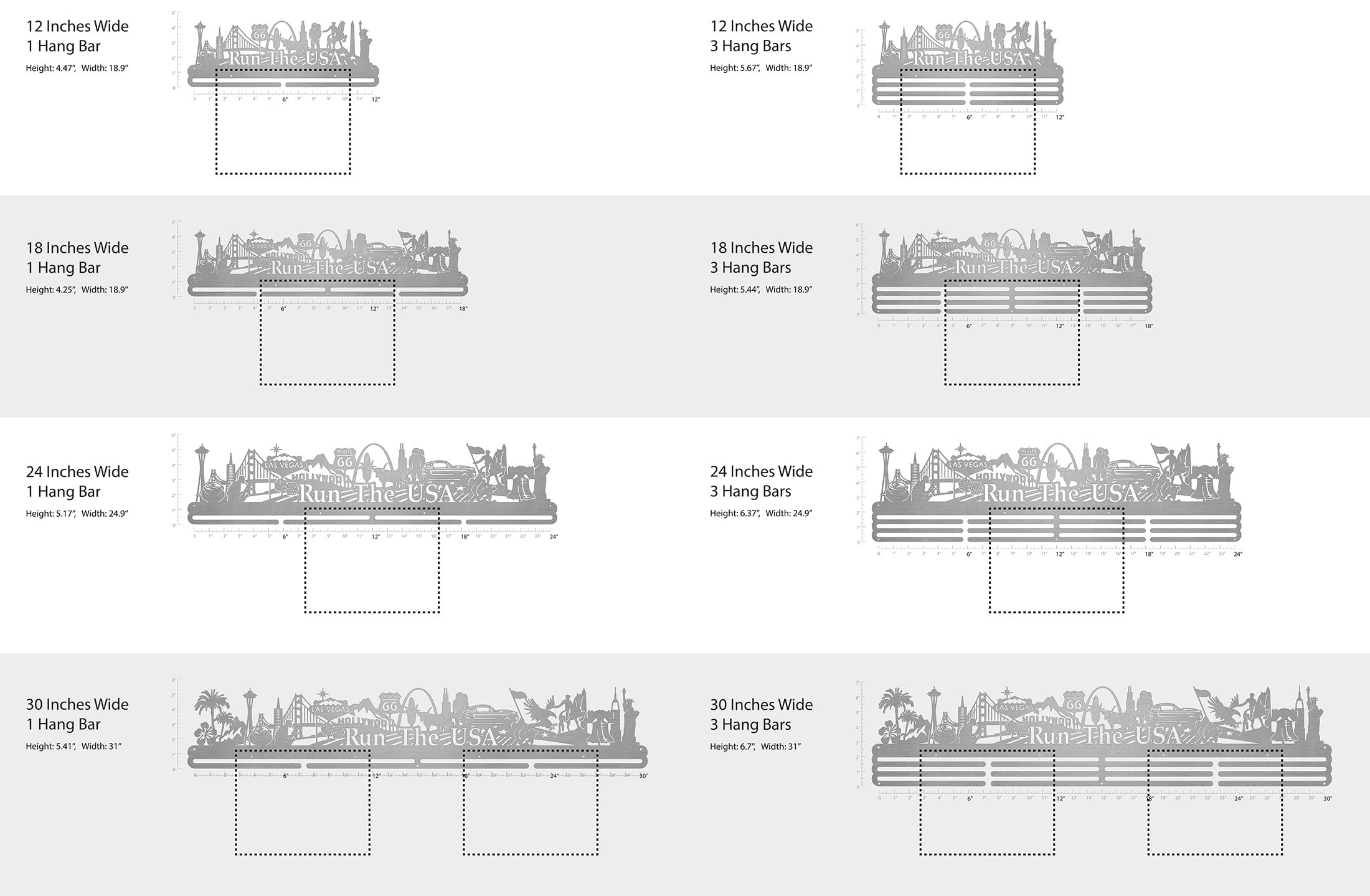 Unsure what size to get? We have created two consistently scaled images to show you what different sized displays look like when filled with medals.