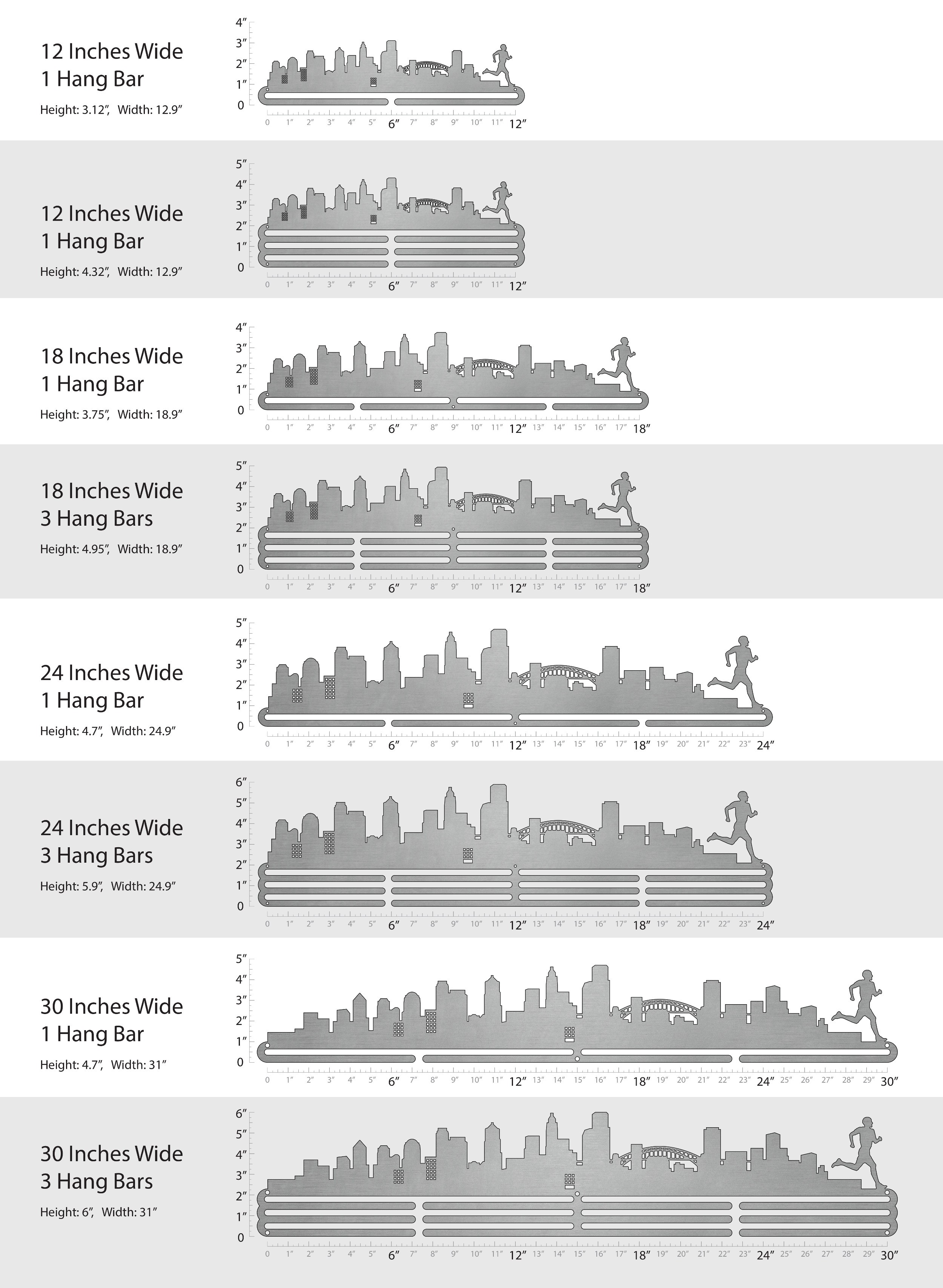 Unsure what size to get? We have created two consistently scaled images to show you what different sized displays look like when filled with medals.
